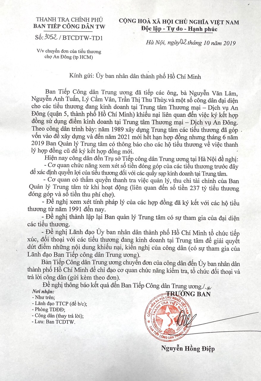Do đơn KN không được giải quyết theo quy định pháp luật, tiểu thương đã trực tiếp ra Hà Nội gửi đơn và gõ cửa các cơ quan Trung ương. Ngày 2/10/2019, Ban Tiếp Công dân Trung ương đã có Văn bản số 3052/BTCDTW-TD1, gửi UBND TP.Hồ Chí Minh có nội dung: Theo công dân trình bày năm 1989 xây dựng TTTMDV An Đông, các tiểu thương đã góp vốn vào để xây dựng và đến năm 2021 mới hết hạn hợp đồng nhưng tháng 6/2019, Ban quản lý TTTMDV An Đông có Thông báo cho các hộ tiểu thương về việc thanh lý hợp đồng cũ để ký kết hợp đồng mới. Hiện nay, công dân đến Trụ sở Tiếp công dân Trung ương tại Hà nội đề nghị: