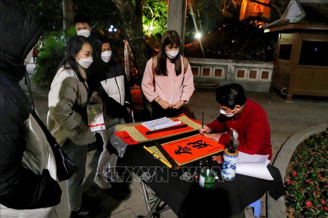 Người dân xin chữ ông đồ tại đền Ngọc Sơn (Ảnh TTXVN).