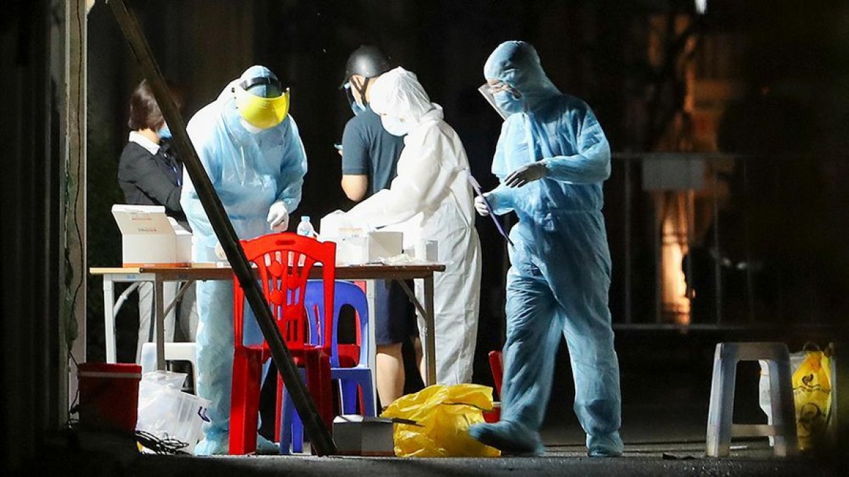 Đêm 17/9, lực lượng chức năng tiến hành xét nghiệm nhanh COVID-19 cho người dân tại ngõ 22 Kim Quan, phường Việt Hưng, quận Long Biên sau khi tại đây xuất hiện ca mắc COVID-19. Ảnh: Tiền phong