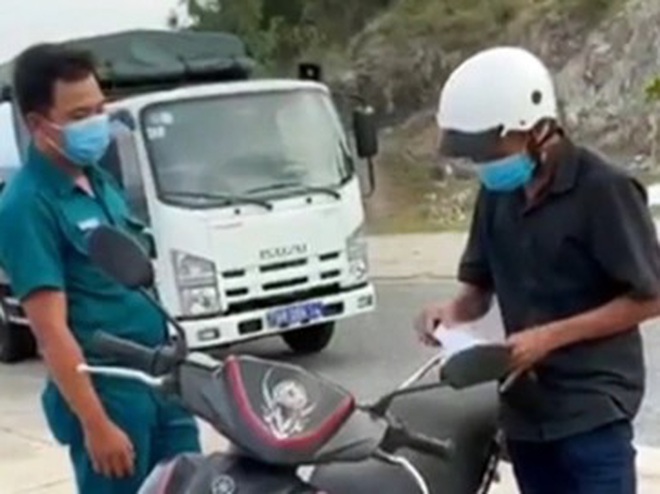 Anh E. (áo đen) xuất trình giấy tờ với tổ công tác liên ngành phòng, chống Covid-19 phường Vĩnh Hòa (Ảnh: Trích xuất từ clip)