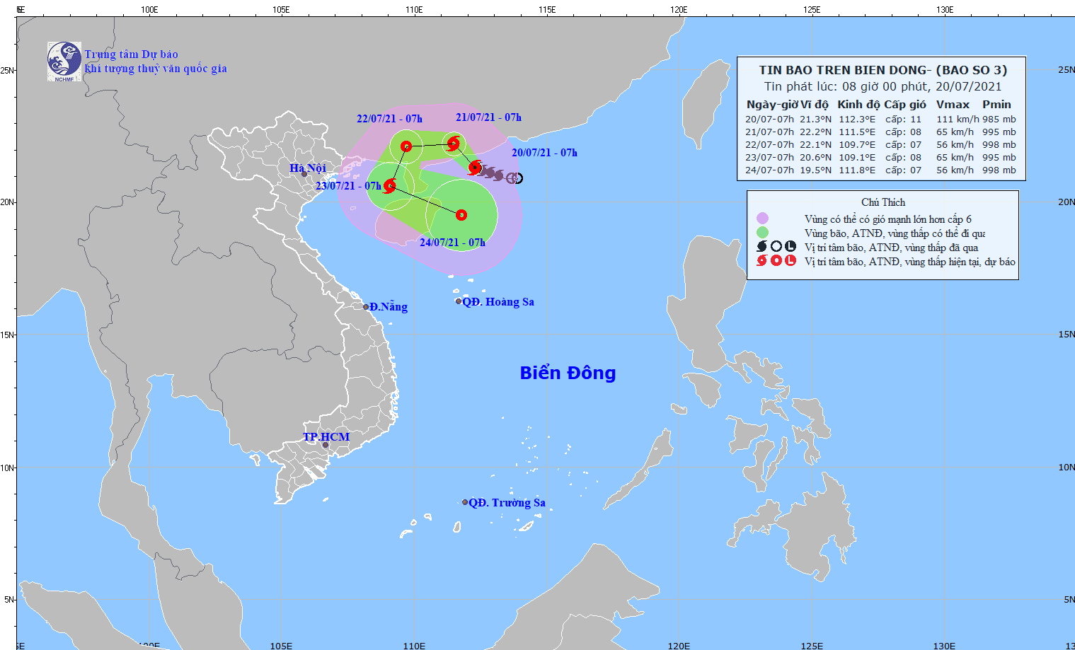 Cụ thể, lúc 7 giờ ngày 20/7, vị trí tâm bão ở khoảng 21,3 độ Vĩ Bắc; 112,3 độ Kinh Đông, ngay trên vùng biển phía Nam của tỉnh Quảng Đông (Trung Quốc). Sức gió mạnh nhất vùng gần tâm bão mạnh cấp 10-11 (90-120km/giờ), giật cấp 13. Bán kính gió mạnh từ cấp 6, giật từ cấp 8 trở lên khoảng 150km tính từ tâm bão; bán kính gió mạnh cấp 10, giật cấp 12 khoảng 50km tính từ tâm bão.