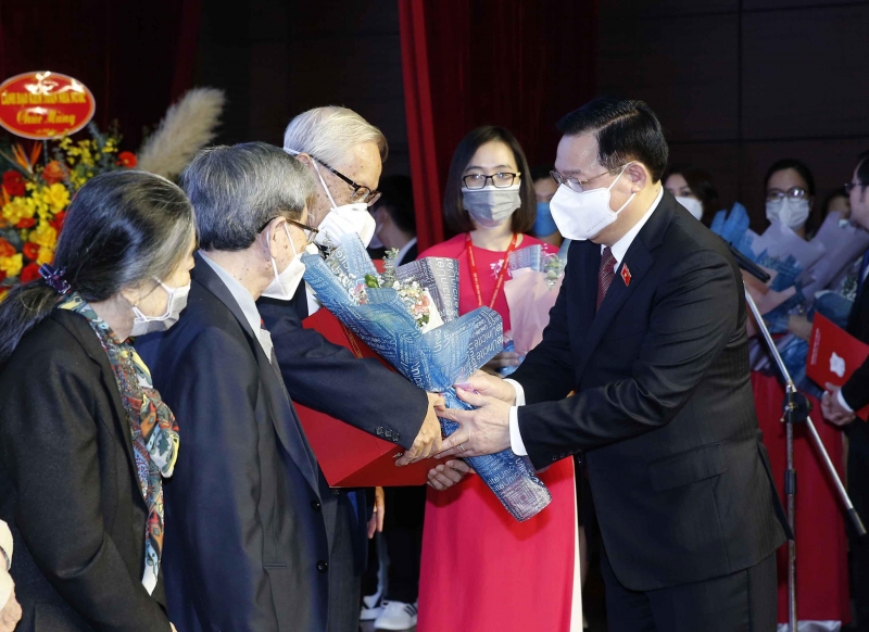 Chủ tịch Quốc hội Vương Đình Huệ tặng hoa, quà tri ân các thầy, cô của Trường Đại học Y Hà Nội. (Ảnh: Baodansinh)