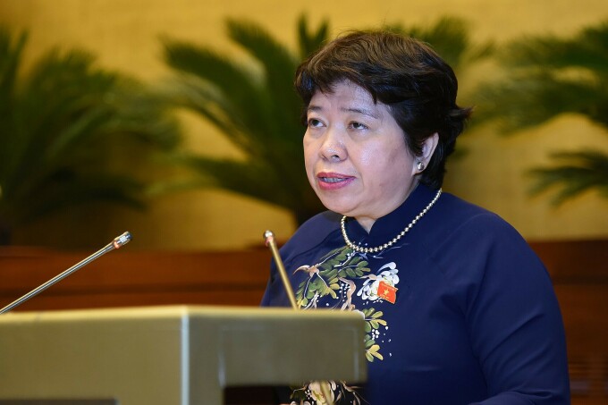 Bà Nguyễn Thúy Anh, Chủ nhiệm Ủy ban Xã hội, trình bày báo cáo thẩm tra công tác phòng, chống Covid-19 sáng 20/10. (Ảnh: Hoàng Phong)