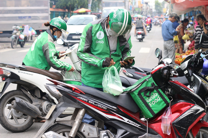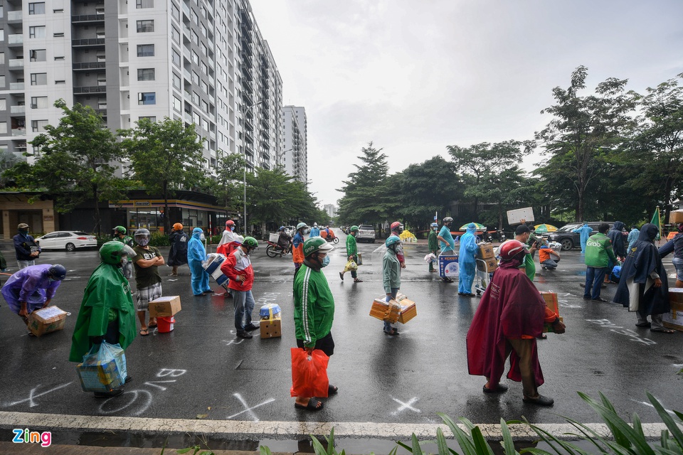Mỗi ngày có hàng trăm shipper xếp hàng để chuyển đồ đạc cho các bệnh nhân bên trong quần thể bệnh viện dã chiến số 3, 6, 7, 8, 9 tại khu tái định cư Thủ Thiêm.