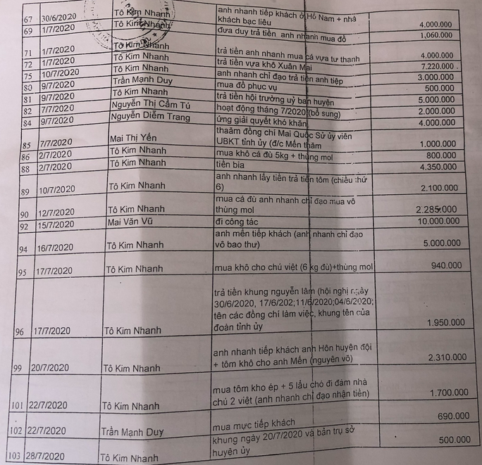Ngày 22-5-2020, một khoản chi 5 triệu đồng được ghi chú khó hiểu là: "đưa cho anh Vũ đưa chú 2 Việt hỗ trợ đồng chí Việt (Ủy ban Kiểm tra Tỉnh uỷ)".