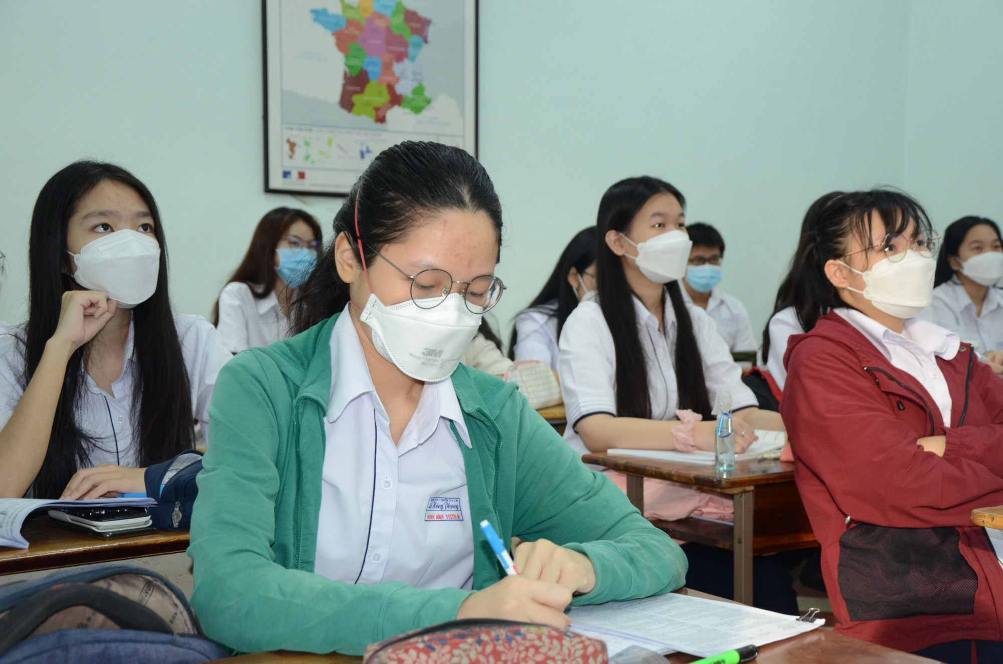 Học sinh lớp 12 Trường THPT chuyên Lê Hồng Phong (TPHCM) trong buổi học trực tiếp đầu tiên năm học 2021-2022.