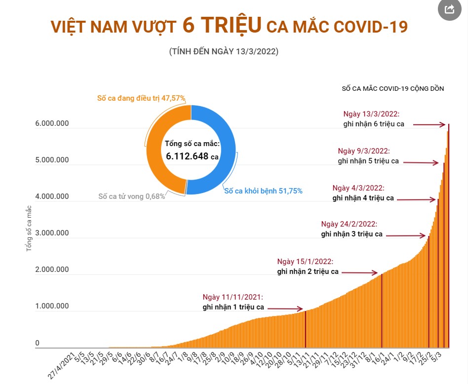 Kể từ đầu dịch đến nay Việt Nam có 6.112.648 ca nhiễm, đứng thứ 20/225 quốc gia và vùng lãnh thổ, trong khi với tỷ lệ số ca nhiễm/1 triệu dân, Việt Nam đứng thứ 130/225 quốc gia và vùng lãnh thổ (bình quân cứ 1 triệu người có 61.879 ca nhiễm).