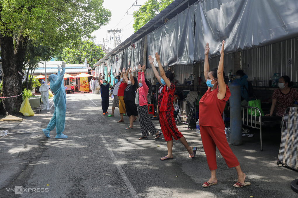 Bác sĩ chăm sóc và hướng dẫn bài tập phục hồi phổi cho F0 tại Bệnh viện Phục hồi chức năng và Điều trị bệnh nghề nghiệp (quận 8, TP HCM), ngày 21/9. Ảnh: Quỳnh Trần