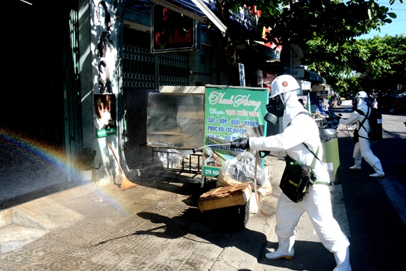 Bộ đội Hóa học phun khử khuẩn tiệm cắt tóc Thanh Hương (số 278 Nguyễn Phước Nguyên, phường An Khê, quận Thanh Khê, TP Đà Nẵng) nơi có ca nhiễm Covid-19 (Ảnh qdnd.vn).