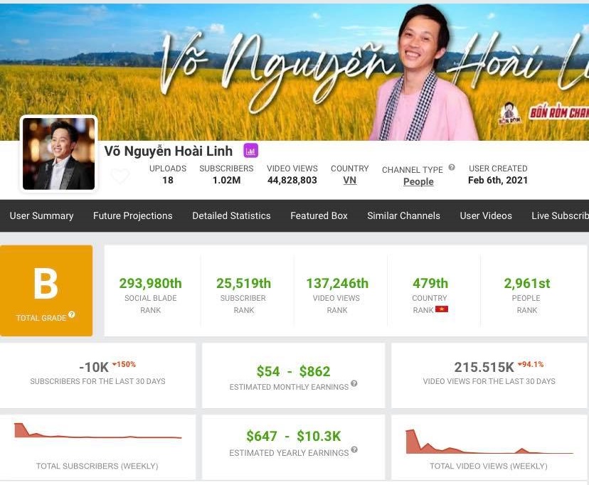 Số liệu thống kê từ trang Socialblade đã cho thấy sự giảm sút nghiêm trọng về các chỉ số ảnh hưởng đến doanh thu của kênh Youtube mà Hoài Linh sở hữu.