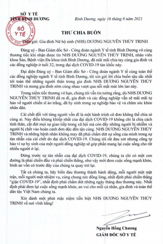 Thư chia buồn của Giám đốc Sở Y tế tỉnh Bình Dương gửi đến gia đình nữ hộ sinh Dương Nguyễn Thùy Trinh.
