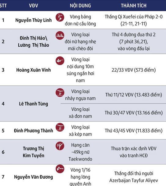 Ngày 24/7 là ngày có nhiều VĐV Việt Nam bước vào thi đấu các môn: Cầu lông, boxing, thể dục dụng cụ, bắn súng, taekwondo.