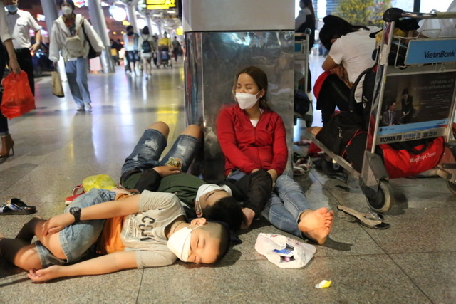 Sáng 27/1, bên cạnh hàng ngàn người xếp hàng chờ làm thủ tục để về quê đón Tết tại sân bay Tân Sơn Nhất (TP Hồ Chí Minh) thì cũng có hàng trăm người nằm, ngồi vật vờ tại đây vì máy bay bị trễ chuyến.