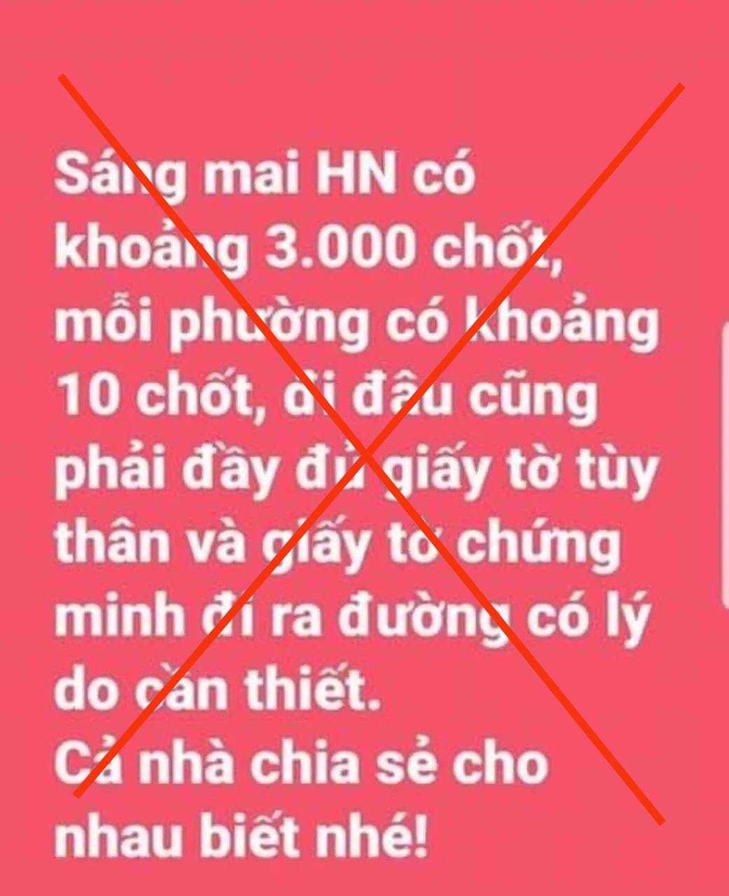 Ngày 26/7, trên mạng xã hội facebook bất ngờ xuất hiện một bài đăng có nội dung: “sáng mai Hà Nội có khoảng 3.000 chốt, mỗi phường có khoảng 10 chốt, đi đâu cũng phải có đầy đủ giấy tờ tuỳ thân và chứng minh lý do ra đường có lý do cần thiết. Cả nhà chia sẻ cho nhau biết nhé”.