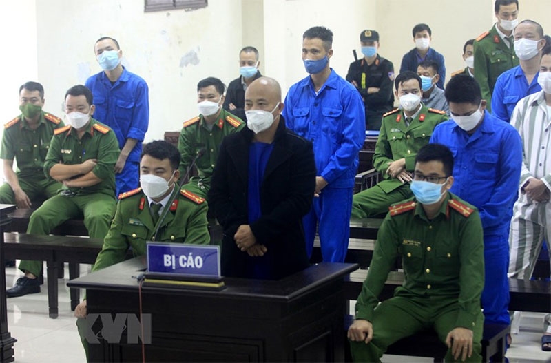 Nguyễn Xuân Đường (áo đen) tức Đường "Nhuệ" cùng các bị cáo tại tòa tháng 11-2021. Ảnh: TTXVN