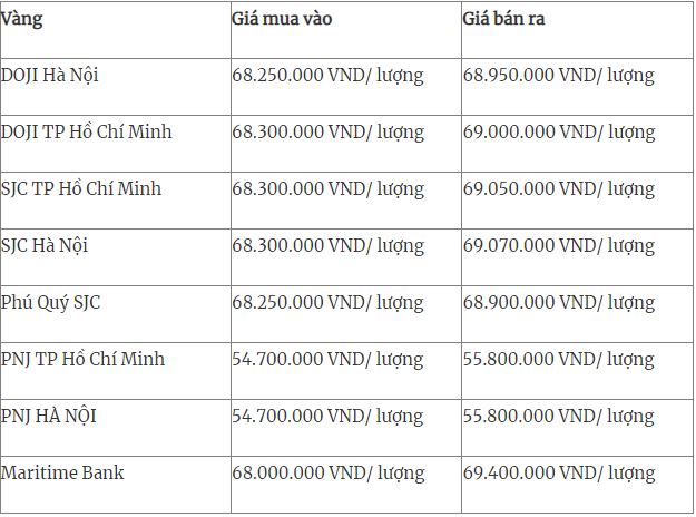 Trong khi đó, vàng các thương hiệu khác giữ nguyên mức giao dịch của ngày trước đó. Hiện tại, vàng DOJI ở khu vực TP Hồ Chí Minh đang mua vào mức 68,3 triệu đồng/lượng và bán ra mức 69 triệu đồng/lượng. Ở khu vực Hà Nội, giá vàng DOJI đang là 68,25 triệu đồng/lượng mua vào và 68,95 triệu đồng/lượng bán ra.