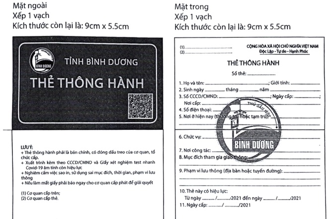 Trước đó, UBND tỉnh Bình Dương ban hành công văn hỏa tốc chỉ đạo các đơn vị, địa phương thực hiện việc tổ chức cấp thẻ thông hành để quản lý chặt hơn người và phương tiện lưu thông tại các vùng trong thời gian thực hiện giãn cách xã hội từ ngày 5/9.