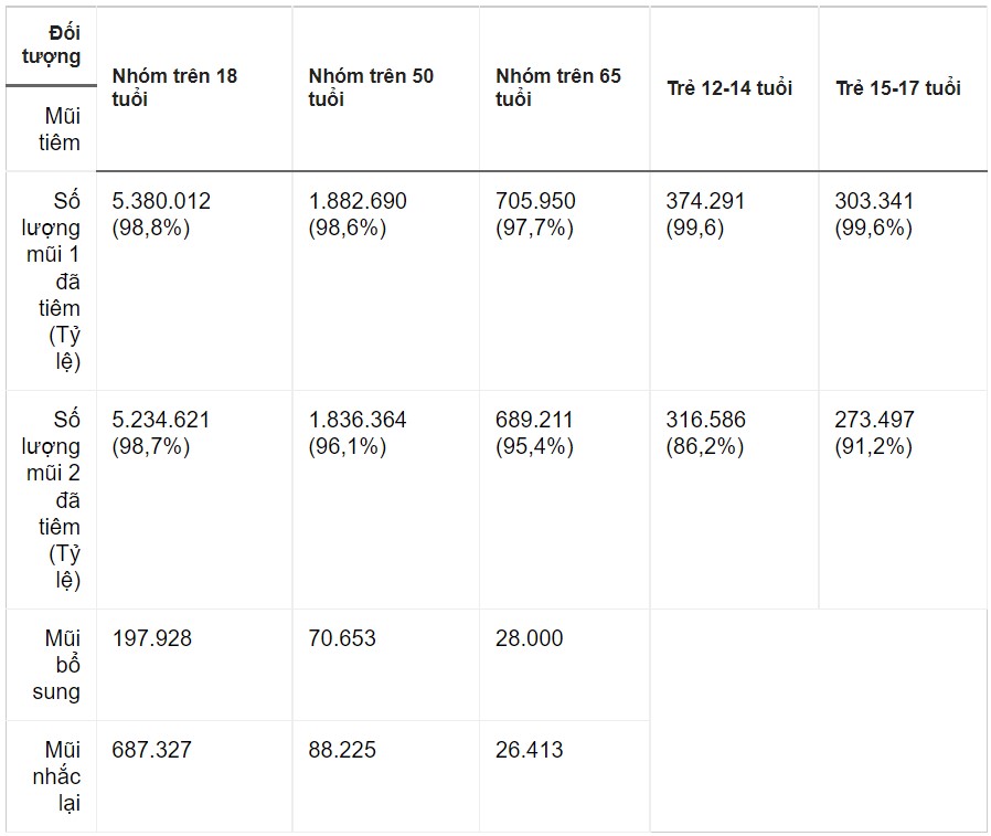 Mặt khác, theo báo cáo của các trung tâm y tế quận, huyện, thị xã gửi về CDC Hà Nội, thành phố đã tiêm được tổng cộng 12.810.699 mũi vaccine phòng bệnh Covid-19. Trong đó, tổng số mũi bổ sung đã tiêm là 197.928, mũi nhắc lại là 687.876.