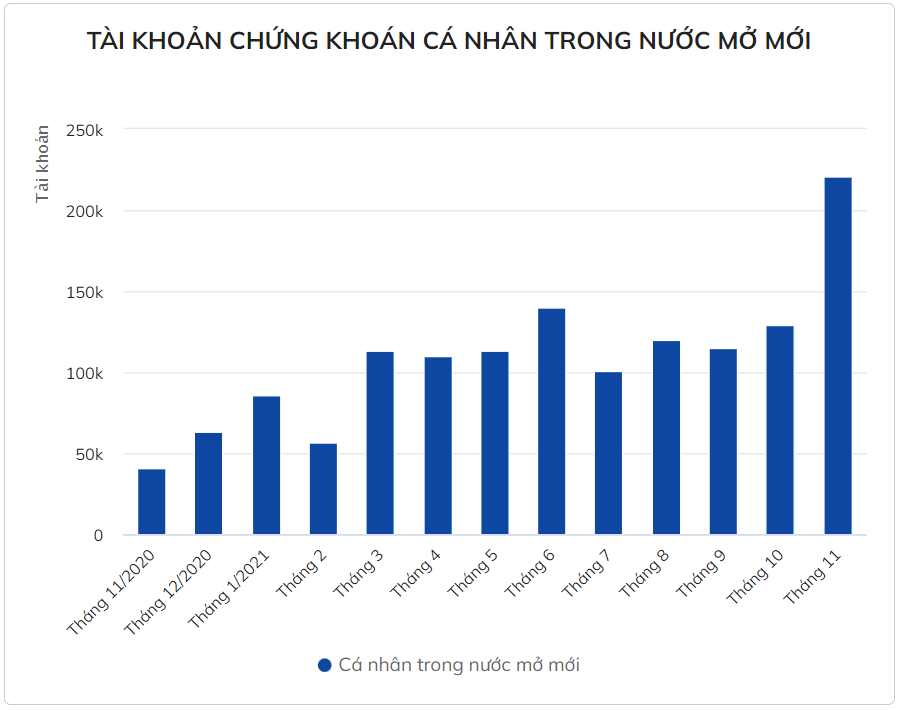 Theo số liệu từ Trung tâm lưu ký chứng khoán (VSD), trong tháng 11, các nhà đầu tư trong và ngoài nước đã mở tổng cộng 221.314 tài khoản giao dịch chứng khoán. Đây là con số cao kỷ lục trong một tháng, thậm chí còn cao hơn con số đạt được trong cả năm 2019 (192.567 tài khoản).