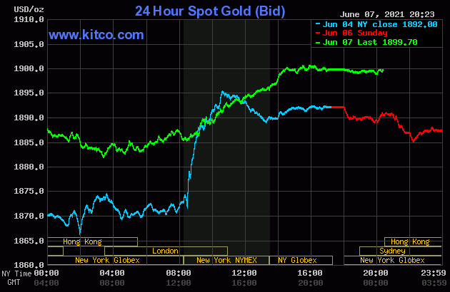 Trên thị trường thế giới, cuối giờ chiều 7/6 (theo giờ Việt Nam) giá vàng giao dịch được niêm yết trên Kitco là 1.885,6 USD/oz, giảm 2,2 USD/oz so với mở phiên giao dịch.