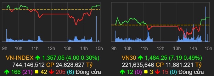 Chốt phiên, VN-Index tăng 4 điểm (0,3%) lên 1.357 điểm. VN30-Index tăng hơn 7 điểm (0,49%) lên 1.484,25 điểm. Trên sàn Hà Nội, HNX-Index và UPCOM-Index cùng vượt trên tham chiếu.