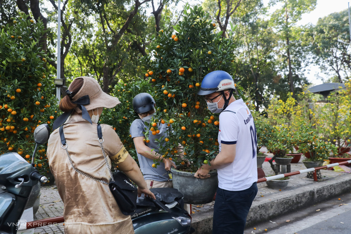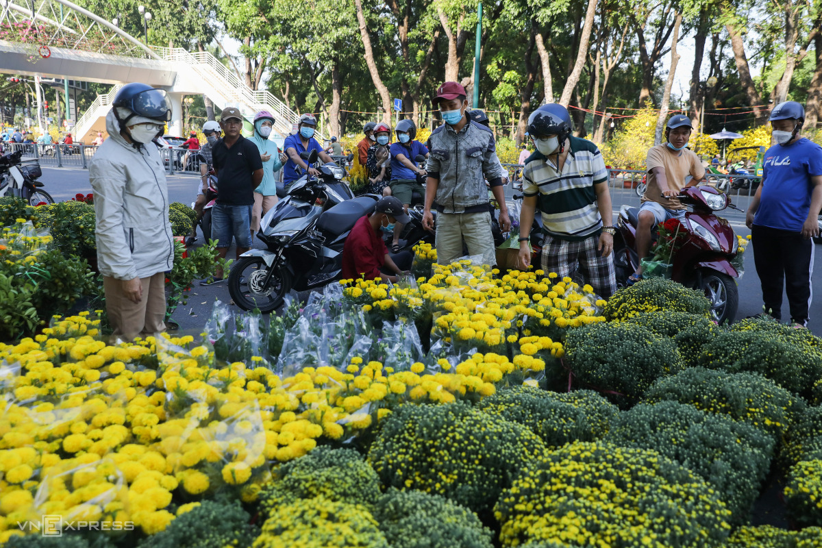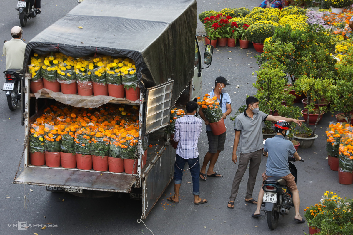 Chủ vựa Trần Văn Trình (đội mũ đen) chở xe tải mang thêm hoa vạn thọ, cúc từ huyện Chợ Lách (Bến Tre) để kịp bán cho hết hàng. "Năm nay tôi chở 5 xe với khoảng 1.500 chậu hoa lên bán. Dịch nên nhiều nhà vườn trồng ít hoa này vì vậy khá đắt hàng, giá hôm nay chỉ giảm xíu so với lúc mới mang lên", anh Trình nói.