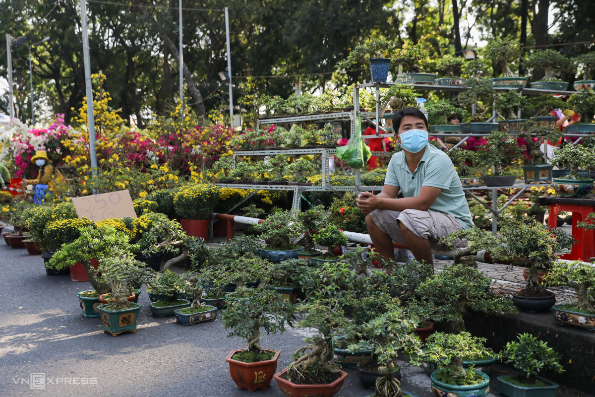 Anh Dương Minh Thạnh ngóng chờ khách mua kiểng nhưng từ sáng giờ chưa bán được chậu nào. "Năm nay tôi mang 300 chậu lên mà cả tuần nay mới bán được cỡ 15 cây thôi. Mặt hàng này kén khách, ai thích bonsai mới mua chưng Tết. Cũng may tôi có bán trên mạng nữa nên chắc huề vốn", người đàn ông 34 tuổi nói.