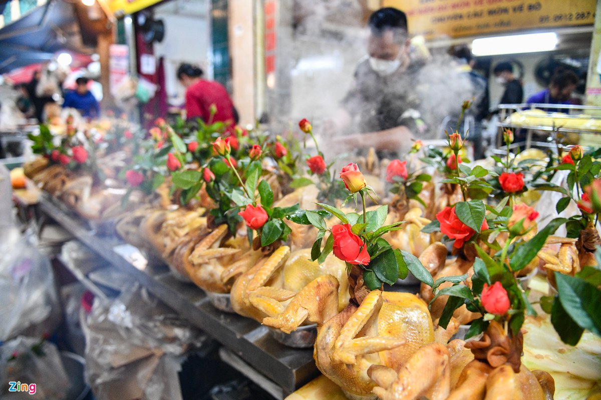 Gà cúng giao thừa là những con ngậm hoa hồng, bày sẵn ở ngoài để khách chọn lựa. Đây là mặt hàng nổi tiếng và hút khách nhất tại khu chợ này.