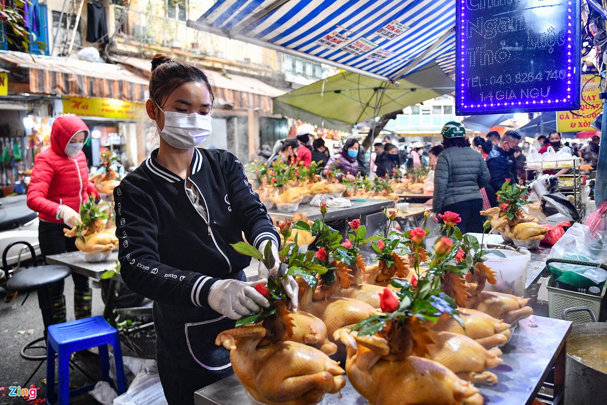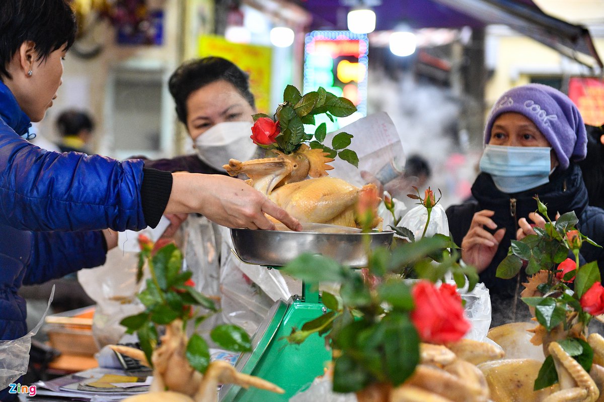 Ảnh hưởng của dịch bệnh nhưng người dân vẫn duy trì thói quen tới đây mua gà ngậm hoa để cúng Giao thừa. Mỗi cửa hàng bán được vài trăm con trong ngày này.