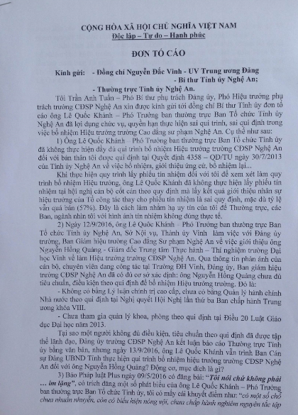 Những sai phạm của ông Lê Quốc Khánh và bà Lê Thị Hoài Nam theo đơn tố cáo của PGS-TS Trần Anh Tuấn có được ông Nguyễn Đắc Vinh- Ủy viên Trung ương Đảng, Bí thư Tỉnh ủy Nghệ An chỉ đạo xử lý?