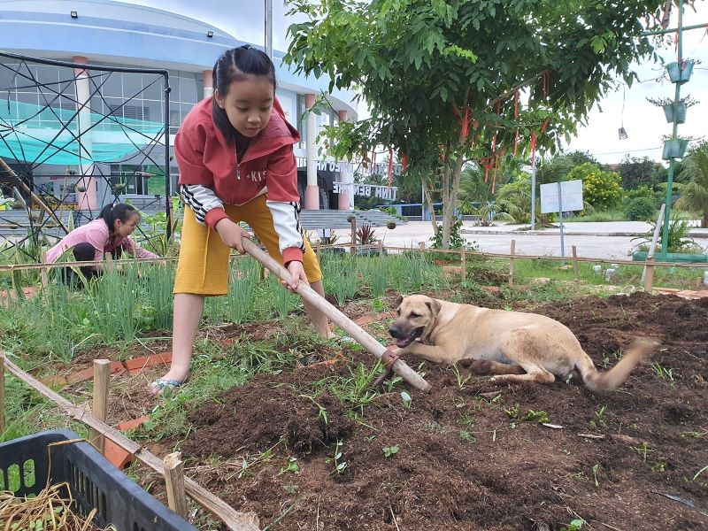 Hàng ngày có rất nhiều học sinh đến vườn sau giờ học buổi chiều. Ở đây các em sẽ tự tay trồng, chăm bón cho những chậu hoa, những luống rau. Chai lọ nhựa được các bạn trẻ tái chế thành những công cụ làm vườn, những chậu trồng cây hay những mô hình, đồ dùng hữu ích.