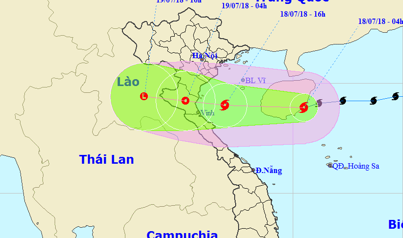 Dự báo trong 24 giờ tới, bão di chuyển nhanh theo hướng Tây, mỗi giờ đi được khoảng 25-30 km; khoảng chiều tối nay (18/7), vùng tâm bão với sức gió mạnh cấp 8, giật cấp 10 sẽ ảnh hưởng trực tiếp đến khu vực ven biển các tỉnh từ Thái Bình đến Hà Tĩnh, sau đó bão sẽ đi vào đất liền và suy yếu thành áp thấp nhiệt đới.