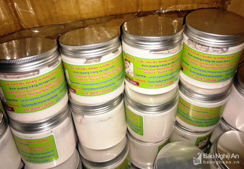 Các hộp kem dưỡng trắng da toàn thân đã đóng gói, chuẩn bị đưa ra thị trường tiêu thụ. Ảnh: Hồng Quang