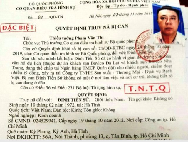 Khi bị Cơ quan điều tra hình sự Bộ Quốc phòng khởi tố vụ án, khởi tố bị can, đồng thời tống đạt các quyết định nêu trên thì Đinh Tiến Sử không có mặt tại nơi làm việc, nơi cư trú. Ngày 7-11, Cơ quan điều tra hình sự Bộ Quốc phòng đã ra quyết định truy nã đối với Đinh Tiến Sử.