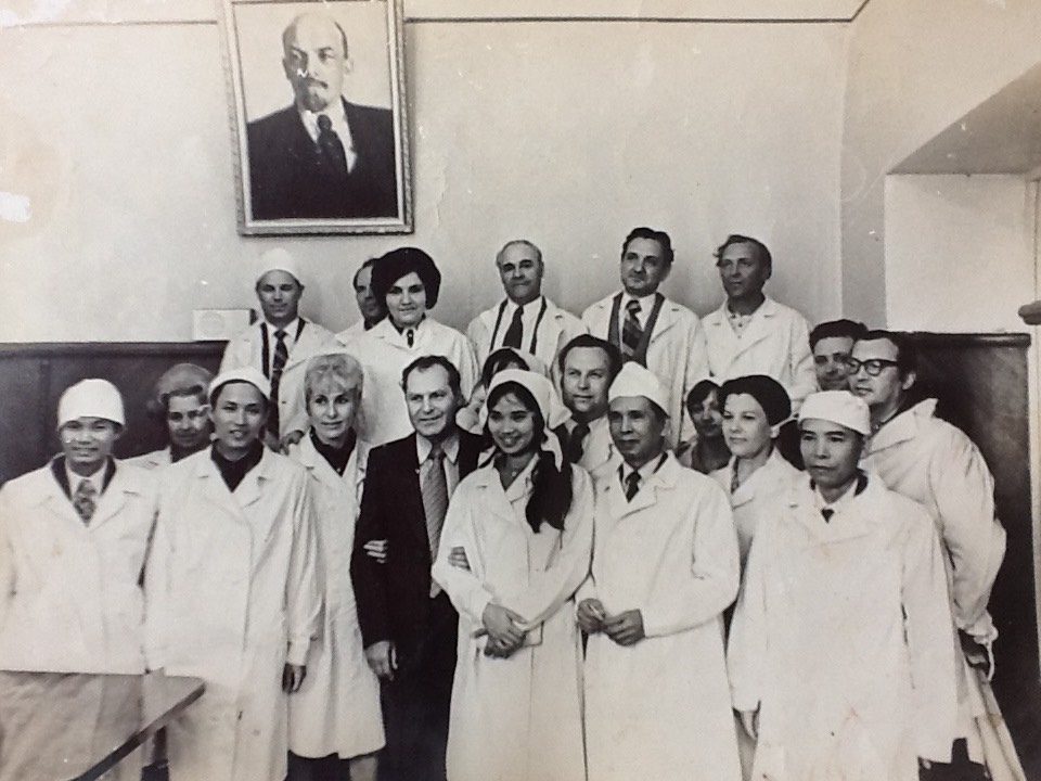 Anh hùng phi công vũ trụ Liên Xô Giec-man Titop (áo đen) chụp hình lưu niệm cùng các y, bác sĩ năm 1977.