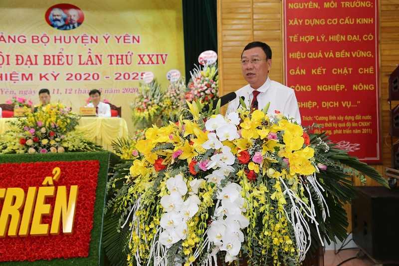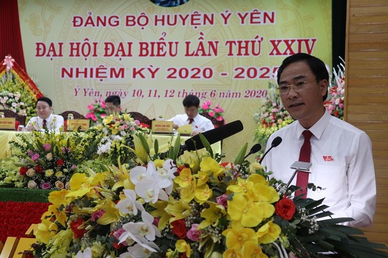 Phát biểu tại Đại hội, đồng chí Đoàn Hồng Phong - Ủy viên Trung ương Đảng, Bí thư Tỉnh ủy, Trưởng đoàn Đoàn đại biểu Quốc hội tỉnh ghi nhận và đánh giá cao những kết quả của Đảng bộ và nhân dân huyện Ý Yên đạt được trong nhiệm kỳ qua. Đồng chí đề nghị nhiệm kỳ tới, huyện cần gắn xây dựng NTM mới nâng cao, kiểu mẫu và tái cơ cấu ngành nông nghiệp, với việc đẩy mạnh đô thị hóa nông thôn; xây dựng chính phủ điện tử, đô thị thông minh; phát triển mạnh mẽ các ngành nghề ở khu vực nông thôn. Khai thác tối đa lợi thế từ những tuyến đường huyết mạch, những cây cầu lớn đi qua để đẩy nhanh phát triển công nghiệp, thương mại, dịch vụ và đô thị. Thực hiện tốt công tác xúc tiến, kêu gọi các nhà đầu tư có vốn lớn, công nghệ cao vào đầu tư. Làm tốt công tác GPMB để đẩy nhanh tiến độ thi công các dự án trên địa bàn huyện. Quan tâm hơn nữa trong việc phát triển toàn diện văn hoá, giáo dục, chăm sóc và nâng cao sức khoẻ cho nhân dân. Thực hiện tốt nhiệm vụ quân sự, quốc phòng địa phương; đảm bảo an ninh chính trị, an ninh nông thôn, an ninh tôn giáo, trật tự an toàn xã hội trên địa bàn huyện.