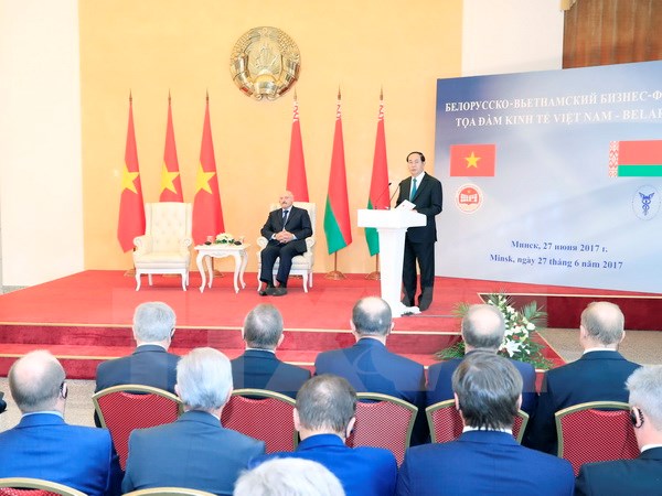 Phát biểu trước cộng đồng doanh nghiệp hai nước, Chủ tịch nước Trần Đại Quang nhấn mạnh, năm 2017 là dấu mốc quan trọng trong quan hệ hợp tác hữu nghị Việt Nam-Belarus khi hai nước kỷ niệm chặng đường hơn 1/4 thế kỷ chính thức thiết lập quan hệ ngoại giao.
