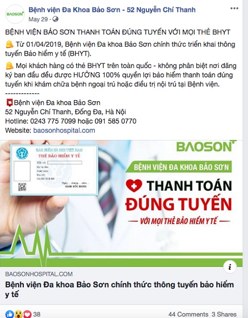 Ngày 29/5/2019, Bệnh viện Đa khoa Bảo Sơn (52 Nguyễn Chí Thanh, Hà Nội) có nội dung quảng cáo đầy đủ đến người dân như sau: "Bệnh viện Bảo Sơn thanh toán đúng tuyến với mọi loại thẻ bảo hiểm y tế. Từ ngày 1/4/2019, Bệnh viện Bảo sơn chính thức thông tuyến BHYT" và "mọi khách hàng có thẻ BHYT trên toàn quốc – không phân biệt nơi đăng ký khám ban đầu đều hưởng 100% quyền lợi thanh toán đúng tuyến khi khám chữa bệnh ngoại trú hoặc nội trú tại Bệnh viện".