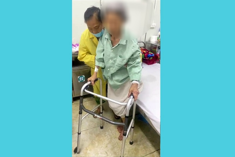 Cụ N.T. H 96 tuổi tập đi tuần đầu sau mổ.