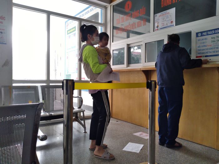 Bệnh nhân đến đăng ký khám chữa bệnh không đảm bảo giãn cách (giãn cách tối thiểu 2 m giữa người) mà không thấy nhân viên, cán bộ y tế nhắc nhở bệnh nhân.