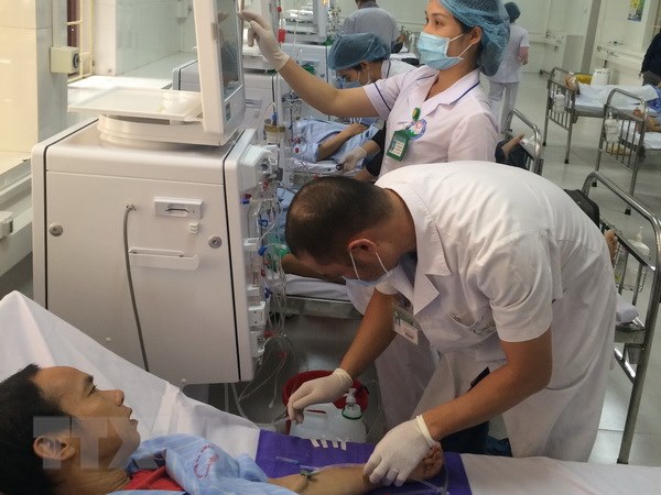 | 12 bệnh nhân đầu tiên được điều trị trong lần khởi động lại Đơn nguyên thận nhân tạo-khoa Hồi sức tích cực-Bệnh viện đa khoa tỉnh Hòa Bình. (Ảnh: Vũ Thị Hà/TTXVN) |