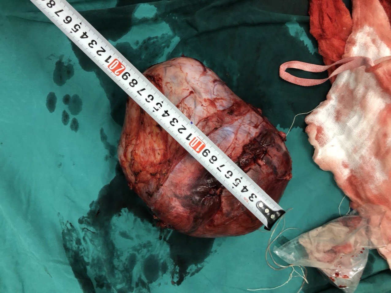 Ngay sau đó, bệnh nhân được chuyển phẫu thuật, dưới sự phối hợp của các bác sỹ khoa Ngoại tiêu hóa và khoa Gây mê – Hồi sức, sau 4 tiếng phẫu thuật cắt khối u các bác sỹ đã lấy ra trong bụng bệnh nhân 1 khối u nặng 2,6kg với kích thước 19x18cm chiếm hết ổ bụng, đè đẩy mạnh ruột non, đại tràng, trực tràng, niệu quản, bàng quang, trong quá trình phẫu thuật bệnh nhân phải truyền 10 đơn vị máu. Đây chính là nguyên nhân khiến bệnh nhân khó đại tiện, đi tiểu liên tục. Ngoài ra khối u ở sát các mạch máu lớn sau phúc mạc, khiến cho việc phẫu tích rất khó khăn và mất máu nhiều.
