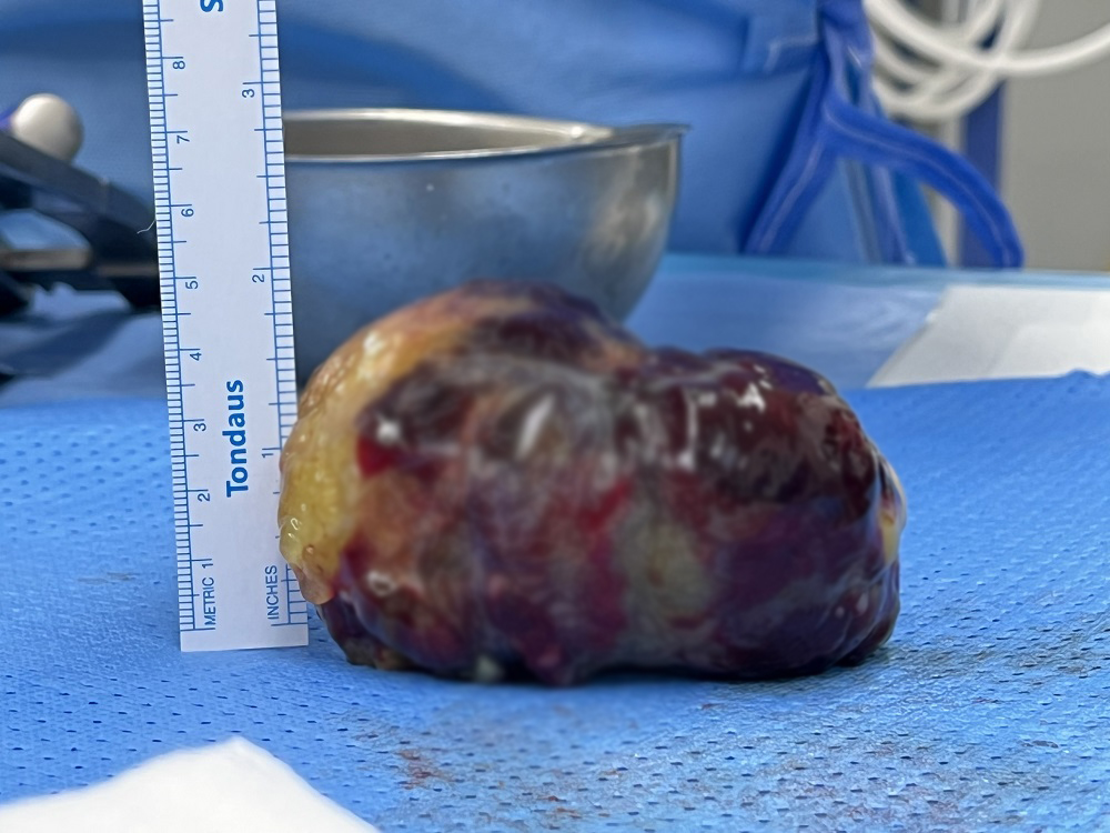 Ngày 28/8, sau hơn 2 tuần điều trị tích cực tổn thương lao đa cơ quan, bệnh nhân được chuyển phòng mổ thực hiện phẫu thuật loại trừ khối u và sửa chữa các thương tổn do u gây ra trên tim. Do tim rất lớn nên kíp mổ lựa chọn kỹ thuật mổ kinh điển qua đường chẻ dọc giữa xương ức, lấy được khối u có kích thước rất lớn 100x95x55mm (lớn hơn khối u nhĩ phải được phẫu thuật vào tháng 5/2021 với kích thước 95x70x68mm).