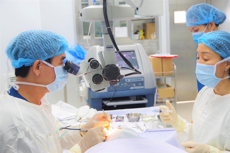 Sau khi khám sàng lọc và được chỉ định phẫu thuật, bệnh nhân được hướng dẫn đến trước một ngày để thực hiện các hồ sơ, thăm khám và làm các xét nghiệm trước khi mổ. Do áp dụng kỹ thuật mổ mắt Phaco hiện đại và dùng thủy tinh thể mềm nên các bệnh nhân không bị đau, vết mổ nhỏ và có thể tháo băng sau vài tiếng.