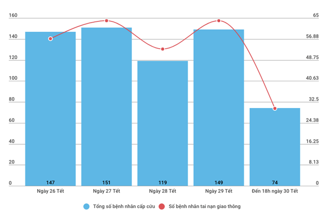 Biểu đồ về số bệnh nhân cấp cứu và số trường hợp bị tai nạn giao thông trong những ngày Tết tại Bệnh viện Hữu nghị Việt Đức.