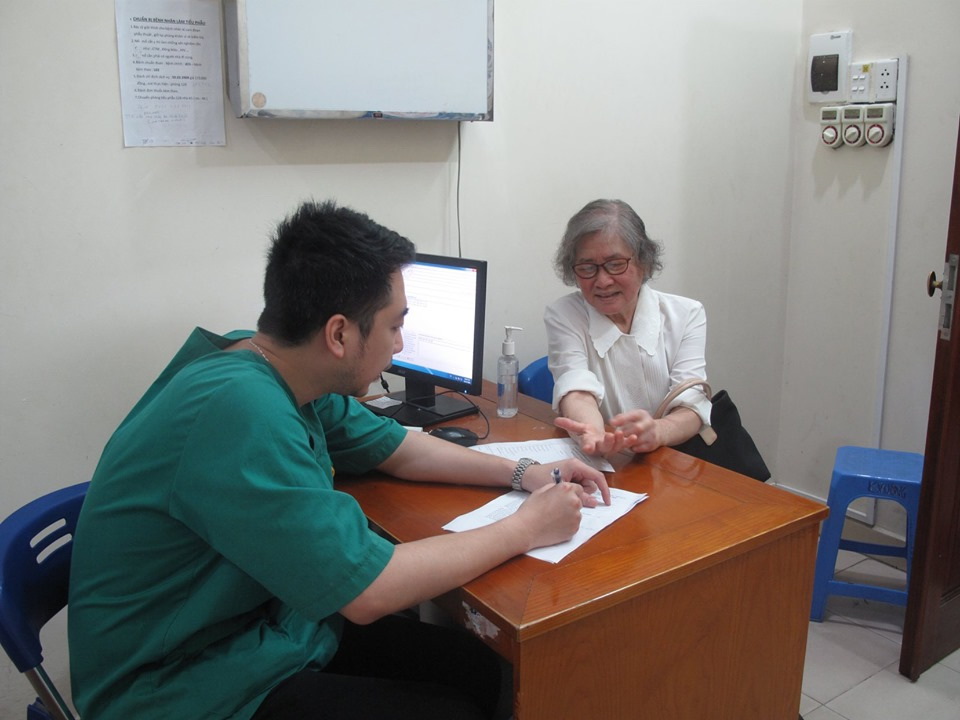 | Các y, bác sĩ bệnh viện Xanh Pôn ân cần tư vấn sức khỏe và phát thuốc miễn phí cho các đối tượng chính sách |