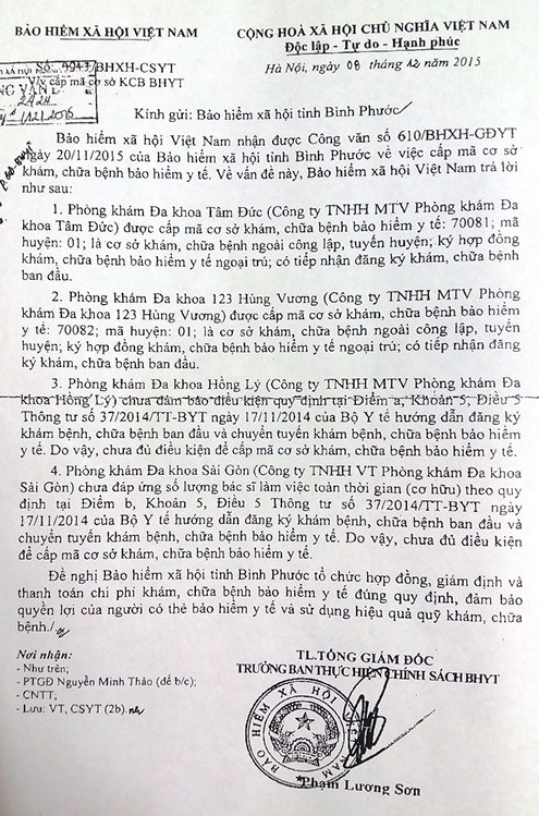 Mới đây nhất, ngày 11/04/2018 Phó Chủ nhiệm Ủy ban về các vấn đề xã hội của Quốc hội đã ký văn bản số 1221/UBVĐXH 14 gửi tiếp Tổng Giám đốc BHXH Việt Nam về việc giải quyết đơn tố cáo của bà Ngô Minh Chiến (phòng khám Tâm Đức) tố cáo hành vi vi phạm trong quản lý nhà nước về BHYT của Phó Tổng giám đốc BHXH, xem xét và giải quyết theo thẩm quyền.