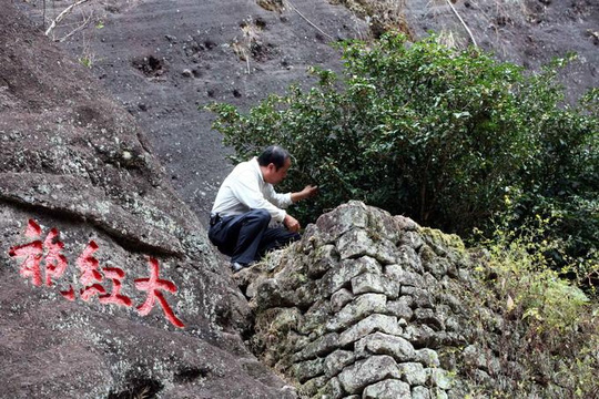 | Vách đá có 3 chữ "Đại Hồng Bào" màu đỏ, nơi còn lại những cây Đại Hồng Bào cổ. Ảnh: whatsonxiamen.com |