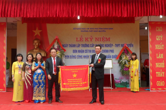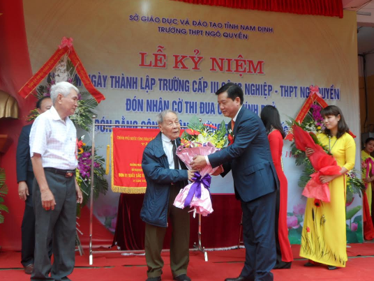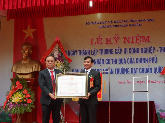 Ông Đoàn Hồng Phong, Ủy viên Trung ương Đảng, Bí thư Tỉnh ủy Nam Định trao cờ thưởng “Đơn vị xuất sắc trong phong trào thi đua” của Chính phủ cho Trường THPT Ngô Quyền. |