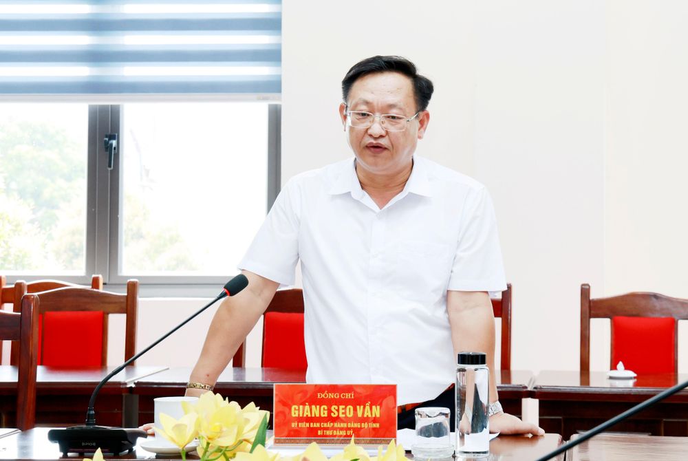 Ông Giàng Seo Vần - Tỉnh ủy viên, Bí thư Đảng ủy xã Mường Khương báo cáo tình hình thực hiện nhiệm vụ với Đoàn công tác.